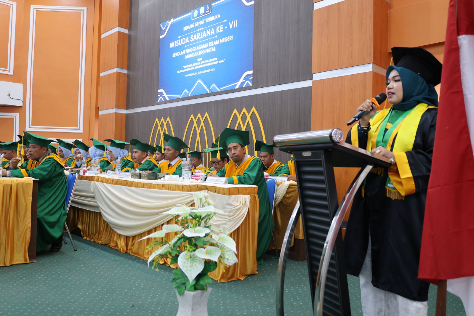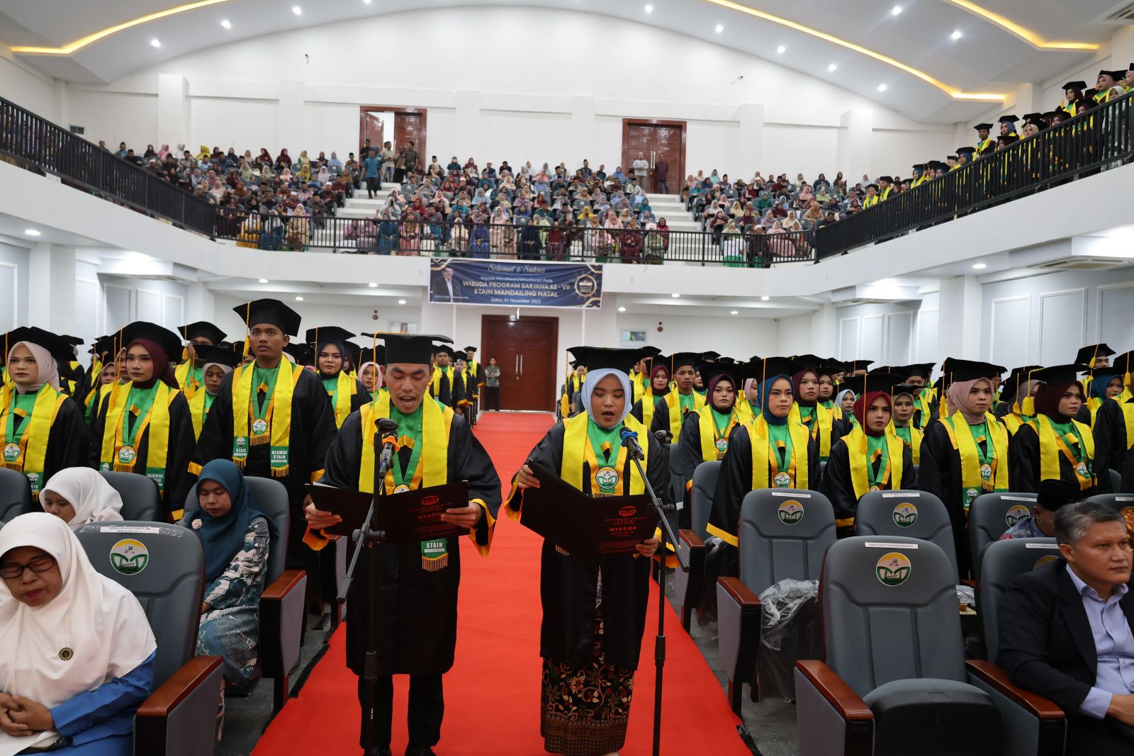 Panyabungan, 1 November 2025 – Sekolah Tinggi Agama Islam Negeri (STAIN) Mandailing Natal kembali menorehkan capaian akademik penting melalui penyelenggaraan Wisuda ke-VII yang digelar pada Sabtu (1/11) di Gedung Student Centre STAIN Madina. Momentum ini menjadi istimewa karena untuk pertama kalinya prosesi wisuda dilaksanakan di gedung Student Centre, pusat kegiatan mahasiswa yang baru difungsikan sebagai ruang representatif akademik. Pada kesempatan tersebut, sebanyak 497 wisudawan dari berbagai program studi resmi dikukuhkan sebagai sarjana.